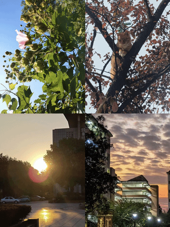 活动期间,参与的同学通过分享自己拍摄的自然风景照片,来展现生活中的“绿色”。每一张照片,都映射出不同的美丽,有阳光透过树叶缝隙,温暖的感觉似乎要冲出镜头;有素雅的小白花,星星点点地点缀在浅绿色的枝叶丛中;还有傍晚时分的银杏树,叶片在半空中,似落非落……同学们分享的照片虽各有千秋,但每张照片都有同学对自然的理解与感受,都无一例外地彰显出自然的美好,唤起人们心中的美好感受。