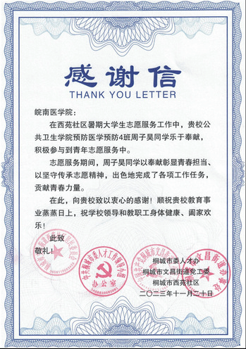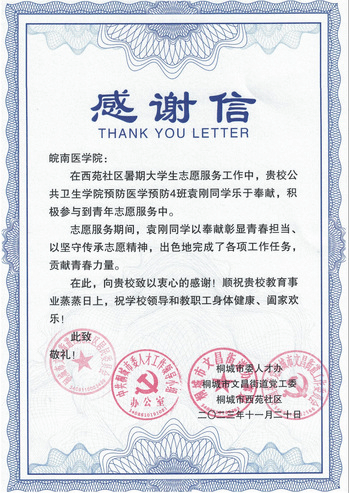 近日,m88官网收到两封来自桐城市委人才办等部门寄发的感谢信,信中对公司2022级预防医学四班周子昊、袁刚同学在暑期积极开展社区老员工志愿服务活动的突出表现表达了衷心感谢。
