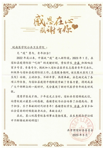 见“疫”勇为,无愧青年担当。在感谢信中,共青团宿松县委员会指出,2022年底以来,中国战“疫”进入了新阶段。2023年1月,在宿松县疫情防控“吃劲”的关键时刻,余鑫同学积极响应家乡号召、青春号令,踊跃加入宿松县医员工志愿者青年突击队,积极参与宿松县疫情防控工作。志愿服务期间,他服从医院(卫生院)安排,主动担当、不辞辛劳、热情奉献,出色地完成了各项工作任务,用实际行动诠释了“奉献、友爱、互助、进步”的志愿服务精神,为宿松县疫情防控贡献了青春力量,得到了广大干部群众的一致好评。