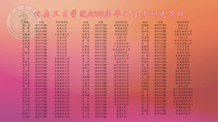 2022届毕业生面对的不仅是实习的忙碌,还有疫情纷扰之下考研的重重压力,对此他们毫无懈怠,不仅出色地完成了实习的任务,还在紧张的氛围中体验到了“读书之乐乐陶陶,起并明月霜天高。”的乐趣,克服疫情下考研的艰难困苦,最终取得佳绩。此次考研中涌现不少学霸班级,2017级预防医学4班升学率59.09%,2017级预防医学8班升学率51.72%,升学率均过半,其他班级也毫不逊色,2017级预防医学6班升学率48.15%,2017级预防医学5班升学率46.43%,2017级预防医学2班升学率46.15%。在紧张的备战时期,同学们互帮互助,相互学习,共同面对困难,最终一同金榜题名,共享喜悦。