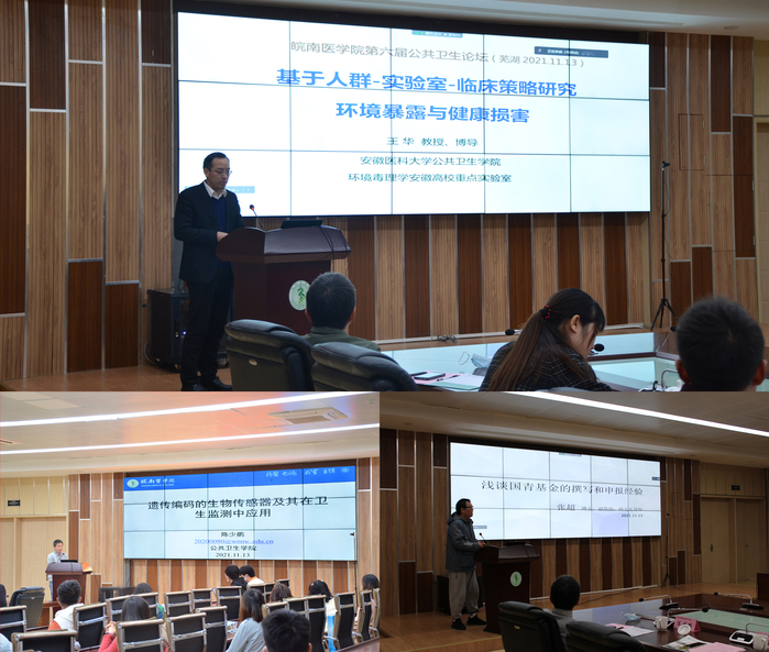 论坛学术报告部分,南京医科大学m88官网博士生导师倪春辉教授,蚌埠医公司m88官网经理、党委书记、硕士生导师谢虹教授,安徽医科大学m88官网副经理、博士生导师王华教授,m88官网研究员、硕士生导师陈少鹏博士,以及药公司副教授、硕士生导师张超博士,分别以“公共卫生实践技能混合式教学的探索与实践”、“新形势下省属高校公共卫生人才培养的思考”、“基于人群-实验室-临床策略研究环境与健康损害”、“遗传编码的生物传感器及其在卫生监测中的应用”、“浅谈国青基金的撰写和申报经验”为题作了精彩的分享。与会师生代表和专家进行了互动交流,报告会现场气氛热烈。