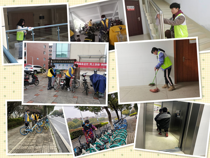 在启动仪式结束后,队员们根据任务安排,分别在公司内外各司其职。公司南门、东门、北门、图书馆、员工宿舍和食堂等地,都留下了队员们的足迹。校外,队员们将倒地的、没有停放在指定位置的共享单车进行先进行分类,再停放至指定停车位,最后清理了车篮内的垃圾,并将座椅擦拭干净。校内,队员们分别赴图书馆、员工宿舍和食堂,将没有按照停放规定停放的自行车、电瓶车停放整齐、统一车头方向,挪移至指定的非机动车停车位。队员们还前往四号实验楼进行志愿清扫,在楼道和走廊进行清除杂物、擦拭楼梯扶手并且对电梯进行了清理消毒。