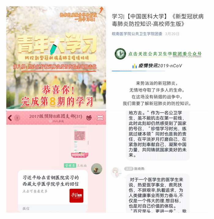 新型冠状病毒感染肺炎疫情的防控工作目前正处于关键时期。习近平总书记强调,要关心关爱广大医务人员,帮助解决实际困难和问题。为贯彻落实习近平总书记重要指示精神,公司开展线上主题团课。线上团课中,公卫学子们紧紧围绕习近平总书记重要回信精神,进行了热烈讨论,并分享了自己的感想和体会。他们纷纷表示,要认真学习领会好习近平总书记重要回信精神,珍惜学习时光,练就过硬专业素养,毕业后到人民最需要的地方去实现人生理想,展现自我价值。此外,m88官网团委微信公众号推送了中国医科大学发布的《新型冠状病毒肺炎防控知识》视频,供同学们学习。同时利用今日校园、QQ群、微信群等平台,认真组织员工学习“青年大学习第八季防控新型冠状病毒肺炎”网上系列团课。同学们积极观看且留言评论发表自己的学习心得。