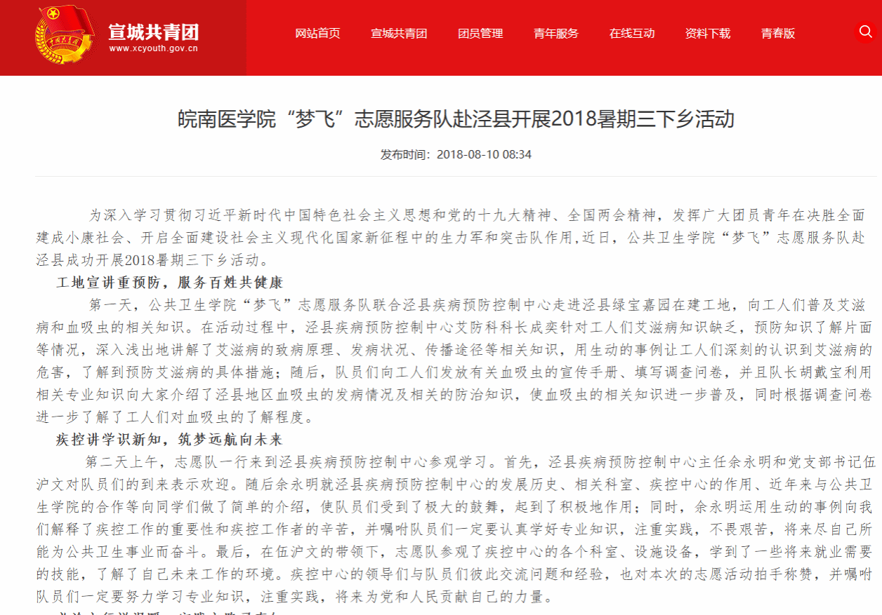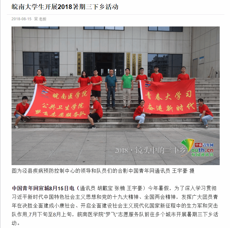 为深入学习贯彻习近平新时代中国特色社会主义思想和党的十九大精神,发挥广大团员青年在决胜全面建成小康社会、开启全面建设社会主义现代化国家新征程中的生力军和突击队作用,引导老员工在社会实践中了解社会、增长知识、磨炼意志、培养品格、奉献社会。m88官网团委认真筹备,指导组建了“芦花”、“梦飞”、“青爱”、“晨光”四支暑期“三下乡”志愿服务队,分赴芜湖、宣城、合肥、淮南、阜阳、黄山、宿州、六安、安庆等地开展多种形式的实践活动。社会实践历时一个多月,全院400多名在校生参与,服务人数多达1000多人。
