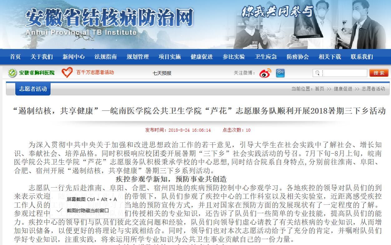 7月下旬-8月上旬,m88官网“芦花”、“青爱”、“梦飞”三支志愿服务队的负责人经过积极联合、精心部署、合理安排,根据队员生源地组建分队,分别前往合肥、黄山、六安、淮南、阜阳等10个地区的市级以及县级的疾病预防控制中心参观学习。各地疾控的领导对队员们的到来表示欢迎,并带领队员们参观疾控中心的工作科室以及相关实验室,向队员们展示各种先进的实验仪器,传授专业知识和简单技能,介绍目前国家在预防方面的发展现状,同时还对各分队接下来的主题活动进行相关的指导并提供了支持。领导们也对队员们的志愿活动给予了充分的肯定,并嘱咐队员们学好专业知识,注重实践,将来运用所学专业知识为公共卫生事业贡献自己的一份力量。