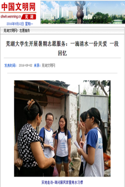 为积极响应校团委号召,m88官网“远航”团队走进芜湖县湾沚镇,开展以“饮用水安全”为主题的“三下乡”社会实践活动,希望结合自己的专业知识,给居民普及关于饮用水的知识,提高农村居民对日常饮用水的关注度。